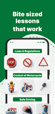 • Motorcycle theory test content that mirrors the layout of the real exam