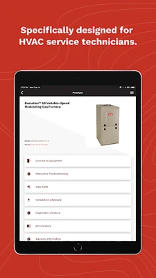 The Carrier Service Technician app provides an easy to use, powerful app that is designed to help the technician standing in front of a unit. The app helps them at the job site to find out what parts they need to make repairs, and it has an on-board GPS to help identify the closest location to find the parts.
