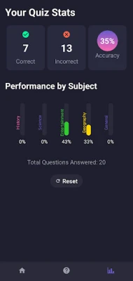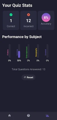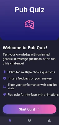 Test your pub quiz brain with an unlimited supply of multiple choice questions and answers. Track your stats and see where your strengths and weaknesses are. Reset the stats page, and start from scratch. Hours of entertainment.